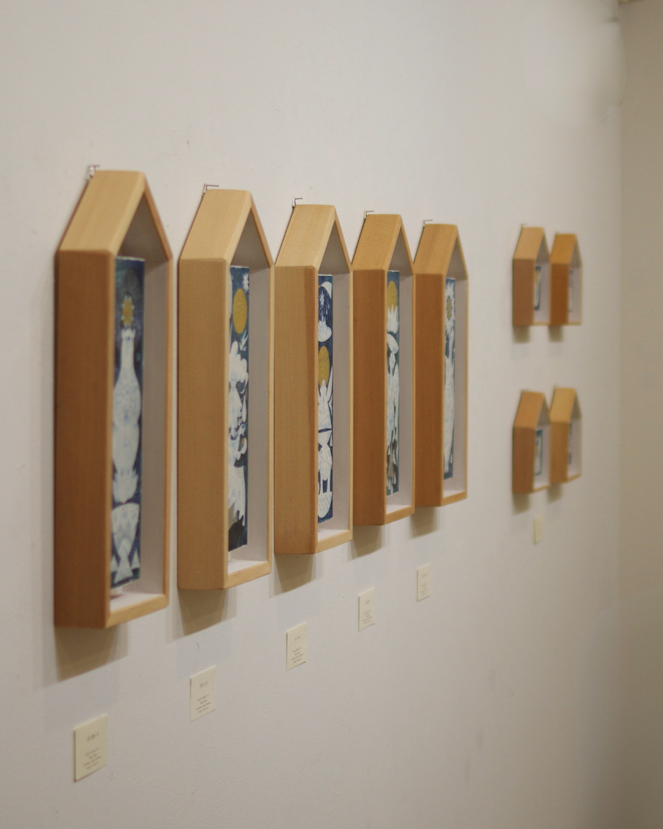 青い作品を中心に、お地蔵さんのような”やさしさ”や”祈り”を感じられるような作品を作りたいと思い制作しています。